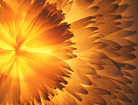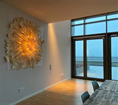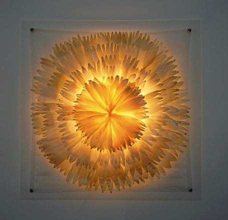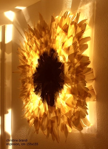 Explosion, 150×150×20 cm, Material: Maisblätter, Organza, Leuchtmittel