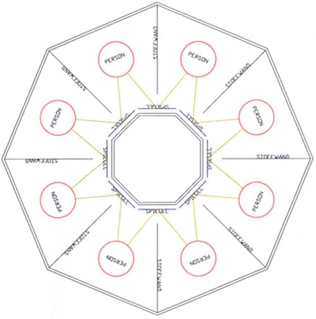 Grundriss:Jede Person ist in einer abgetrennten Kabine. Über Spiegel sieht man seinen rechten und linken Nachbarn.